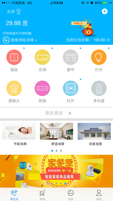 能效管理,節(jié)能省心,有了智生活,無論何時何地,您都可以輕松掌握家庭的用電信息,對比分析家庭用電結(jié)構(gòu),讓您隨時隨地管理家庭用電。智生活在讓您通過手機享受隨時隨地遠程控制家中電器的 樂趣的同時,為您提供空調(diào)、熱歲起等電器的節(jié)能使用策略,更多可創(chuàng)建場景模式,打造一個智能、舒適、便捷的智慧家庭。