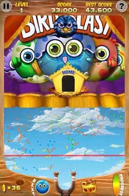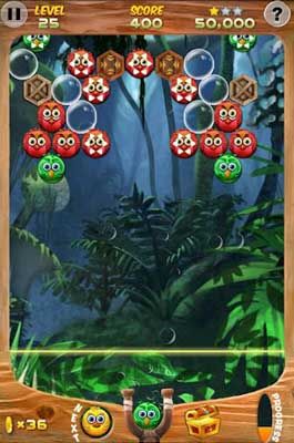 【游戲玩法】三只或三只以上同種顏色的小鳥聚在一起就會被消除掉!與市面上的泡泡龍游戲不同的是,只要玩家擊打到最后的房屋泡泡即可過關,不必全消。