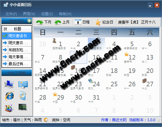 小小桌面日歷是一款免費,綠色,小巧,快速的桌面日歷軟件。 包括日歷農(nóng)歷顯示,日程安排提醒,紀(jì)念日添加管理,天氣預(yù)報等功能, 同時她還具有一個仿Vista的桌面?zhèn)冗厵?,美觀而且簡潔...