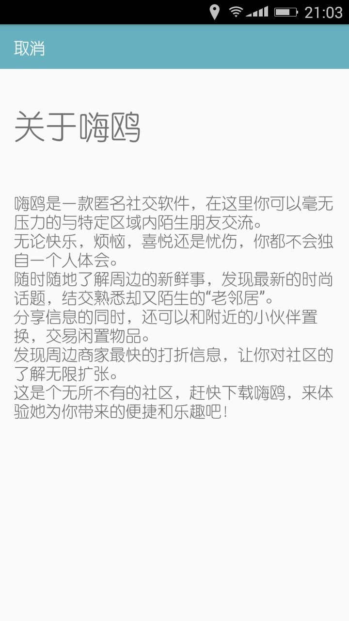 嗨鷗是一款匿名社交軟件,在這里你可以毫無壓力的與特定區(qū)域內陌生朋友交流。無論快樂,煩惱,喜悅還是憂傷,你都不會獨自一個人體會。