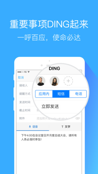 DING信息必達(dá):重要的事可以發(fā)送語音/文字DING,通過電話或短信100%送達(dá);