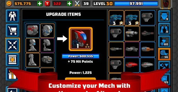 《超級(jí)機(jī)甲SuperMechs》是一個(gè)獨(dú)特的回合制動(dòng)作加上策略戰(zhàn)斗游戲。游戲玩法非常簡(jiǎn)單,就是撿垃圾堆裝備,出去和別的機(jī)甲進(jìn)行戰(zhàn)斗,之后拿著勝利的零件在組裝自己,爭(zhēng)取打敗更強(qiáng)大的敵人。【游戲特點(diǎn)】