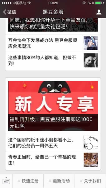 1.如何注冊(cè)新賬戶(hù)?打開(kāi)黑豆金服官網(wǎng),點(diǎn)擊網(wǎng)站首頁(yè)右上方的“注冊(cè)”,或者在賬戶(hù)登陸界面的登陸框右上方,點(diǎn)擊“立即注冊(cè)”,即可進(jìn)入注冊(cè)操作頁(yè)面。