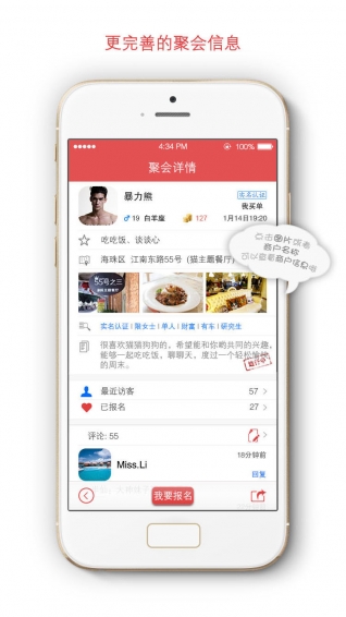 "公開聚會(huì)"可以發(fā)起和報(bào)名參加身邊人的聚會(huì),讓平淡的生活充滿樂趣。