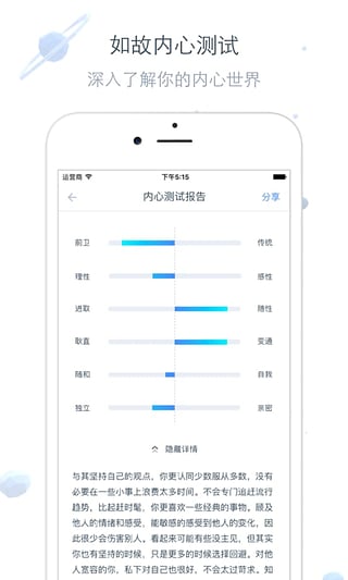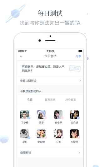 1.在「我的內(nèi)心測試」單元,你可以找到我們新增的「拓展測試包」,完成更多內(nèi)心測試,匹配結(jié)果也會更準(zhǔn)確哦;2.現(xiàn)在,完成「今日測試」后,不僅可以看到與你意見相同的人,還可以看到所有人答題的統(tǒng)計(jì)結(jié)果;