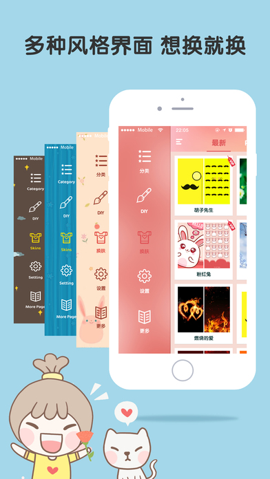 超萌主題每日更新,各種分類應(yīng)有盡有,少女系,萌寵,卡通,情侶配對,節(jié)日,浪漫光影等各種萌主題,且不斷增加中,讓你的手機屏幕萌萌惹人愛!最萌主屏DIY功能來襲,一起來制作屬于自己萌萌噠書架壁紙吧!