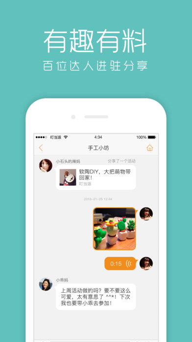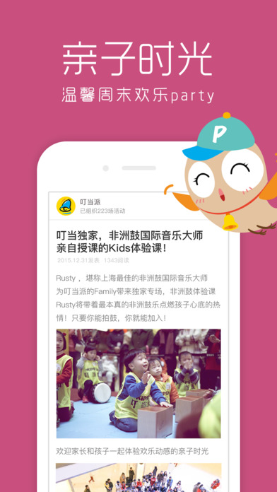 品質(zhì)活動(dòng):叮當(dāng)派為大家尋找、篩選眾多高品質(zhì)獨(dú)家活動(dòng),讓孩子釋放天性,家人共度溫馨親子時(shí)光。藝術(shù)展覽、兒童劇院、自然博物館、橄欖球、沙畫、非洲鼓、暴走徒步、親子跑團(tuán)、牙醫(yī)、烘焙等,總有一類活動(dòng)能讓你和孩子樂享周末。興趣社群:國際范兒的家庭社交平臺(tái),這里聚集了眾多才華橫溢的父母達(dá)人,大家有范兒又好玩,互通海量教育干貨。在這里你可以發(fā)揮自己的特長和興趣,現(xiàn)已有超過100位家庭達(dá)人進(jìn)駐。