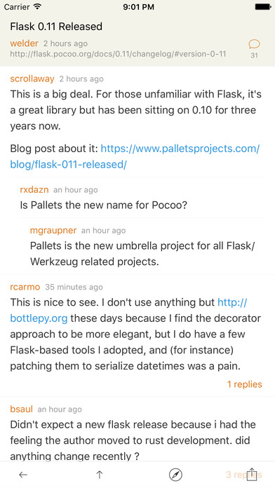 Hacker News 加載很慢,因為 HN 官方 API 的特殊性,列表需要多個請求才能完成,而且在國外,所以更新會稍慢,進入詳情頁面是直接用 WebView 打開這個鏈接,更慢,點擊后面的回復(fù)可以查看回復(fù)列表,目前采用了分級加載的策略,會稍微好點