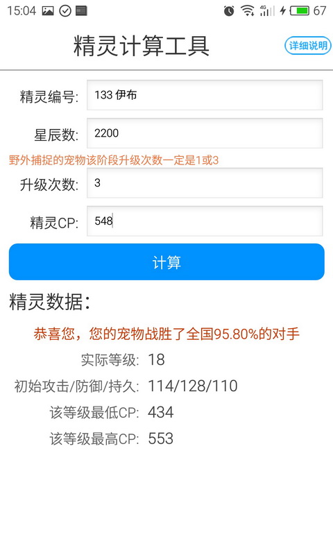 通過(guò)計(jì)算后可以看到該精靈等級(jí)滿(mǎn)值CP是多少,如果您的這只精靈CP值十分接近這個(gè)數(shù)字的話(huà),就說(shuō)明這個(gè)精靈是只好精靈啦!