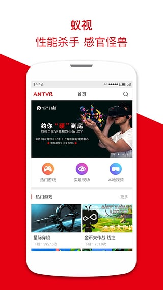 蟻視VR,完美支持大部分虛擬現(xiàn)實設備。提供了大量的虛擬現(xiàn)實游戲,您可以佩戴上蟻視公司的機饕利用手機體驗360°的虛擬現(xiàn)實游戲,享受身臨其境的感覺。