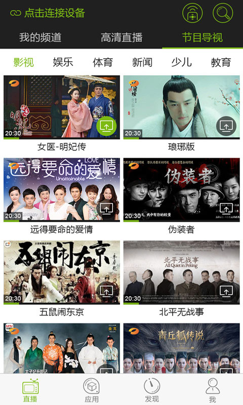 ①高清直播:打開手機(jī)就可查看電視機(jī)上所有頻道正在播出的電視節(jié)目單,點(diǎn)擊節(jié)目名稱就可以直接遙控機(jī)頂盒切換頻道播放此節(jié)目。