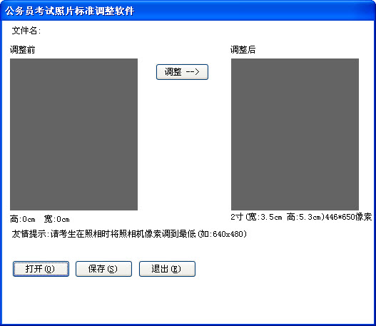 2寸照片生成器操作方法非常簡單,在照相時將照相機像素調(diào)到最低如640*480,打開一張圖片,然后調(diào)整下位置,再點調(diào)整即可。