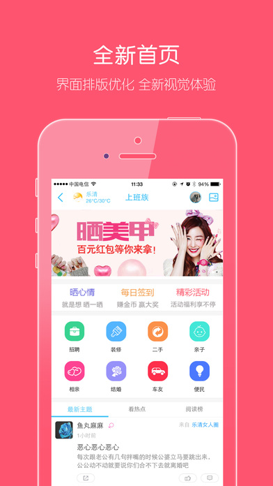 樂(lè)清上班族客戶端是百萬(wàn)樂(lè)清人的選擇!大家在這里討論樂(lè)清熱點(diǎn)信息、爆料八卦、分享消費(fèi)經(jīng)驗(yàn)、參與網(wǎng)友活動(dòng);同時(shí),上班族為大家提供買房、裝修、買車、結(jié)婚、美食、親子培訓(xùn)、旅游等各方面的服務(wù)!【更新日志】