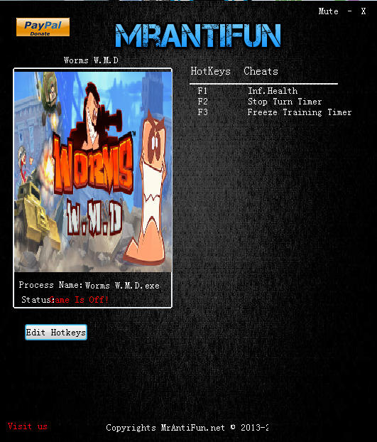 百戰(zhàn)天蟲wmd三項(xiàng)修改器[MrAntiFun],擁有無限生命、停止回合計(jì)時(shí)器、凍結(jié)訓(xùn)練計(jì)時(shí)器三項(xiàng)功能,有愛自取。【軟件功能】