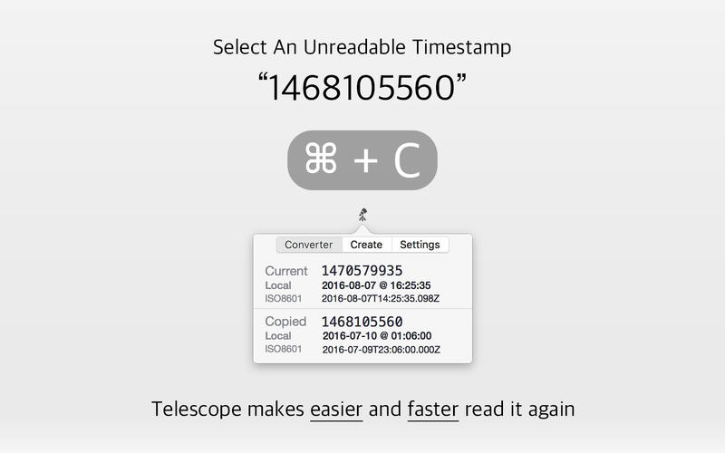 Unix時(shí)間戳不僅被使用在Unix系統(tǒng)、類(lèi)Unix系統(tǒng)中,也在許多其他操作系統(tǒng)中被廣泛采用。對(duì)于一個(gè)開(kāi)發(fā)者來(lái)說(shuō),TelescopeUnix時(shí)間戳轉(zhuǎn)換Mac版是一個(gè)必須的和必要的工具,相信這是一個(gè)開(kāi)發(fā)者需要的軟件。開(kāi)發(fā)者在面對(duì)Unix時(shí)間戳的時(shí)候,往往需要將其轉(zhuǎn)換為我們熟知的人類(lèi)時(shí)間形式,這是一個(gè)需要消耗不少工作效率時(shí)間和功夫的過(guò)程,現(xiàn)在有了TelescopeUnix時(shí)間戳轉(zhuǎn)換Mac版,你只需要將你需要轉(zhuǎn)換的Unix時(shí)間戳粘貼到其中即可完成時(shí)間的轉(zhuǎn)換,就是這么簡(jiǎn)單快速。