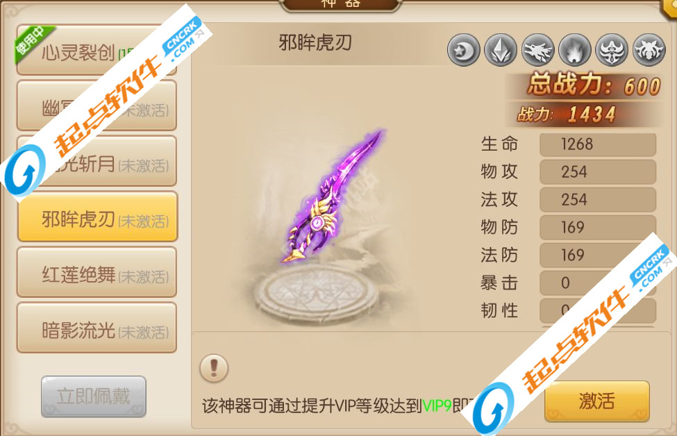 4.邪眸虎刃:該神器可通過提升VIP等級達(dá)到VIP9即可獲得。
