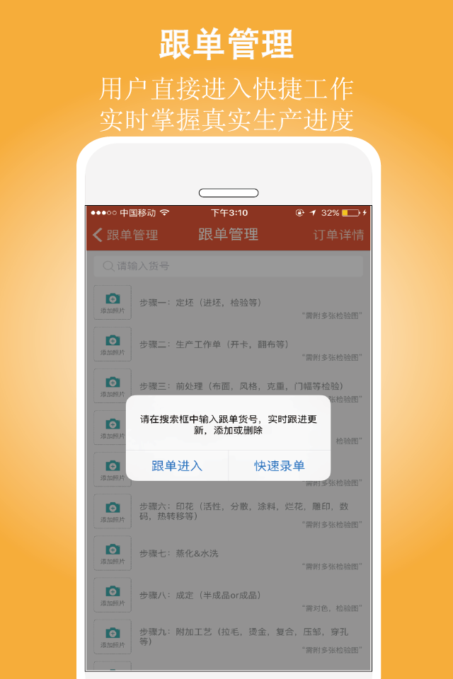 1、跟單管理幫助用戶隨時(shí)隨地精準(zhǔn)掌握跟單跟蹤面料的真實(shí)進(jìn)度,有效提高產(chǎn)品質(zhì)量和保障交期!2、拼單預(yù)售幫助用戶節(jié)省開支,降低成本,拼單后節(jié)省各類小單費(fèi),包缸費(fèi),上機(jī)費(fèi)!同時(shí)帶動(dòng)銷售!