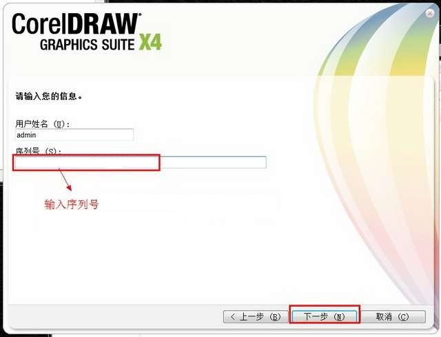 輸入CorelDraw x4【Cdr x4】的序列號(序列號在文件夾“注冊機(jī)”里面也有)點(diǎn)擊“下一步”繼續(xù)操作