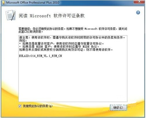 3、在彈出的界面里,選擇我接受此協(xié)議的條款,點(diǎn)繼續(xù)