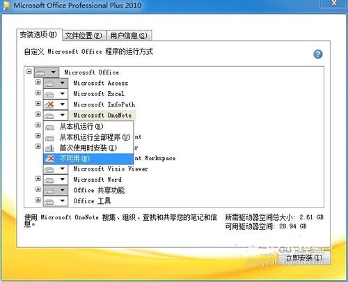 5、在安裝選項(xiàng)里選擇自己需要安裝的功能,不需要的功能可以按下圖步驟選中不可用,及把該功能的圖標(biāo)變成含×的
