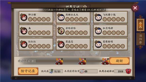3、陰陽(yáng)寮的突破每個(gè)陰陽(yáng)寮打一次都有10分鐘的冷卻時(shí)間,但是不消耗結(jié)界突破券。