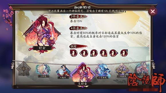 絡(luò)新婦:4破式+2攻擊/暴擊,2號(hào)位一定要速度,46號(hào)位攻擊暴擊都是可選屬性,攻擊優(yōu)于暴擊,后期可以考慮6號(hào)位爆傷屬性。