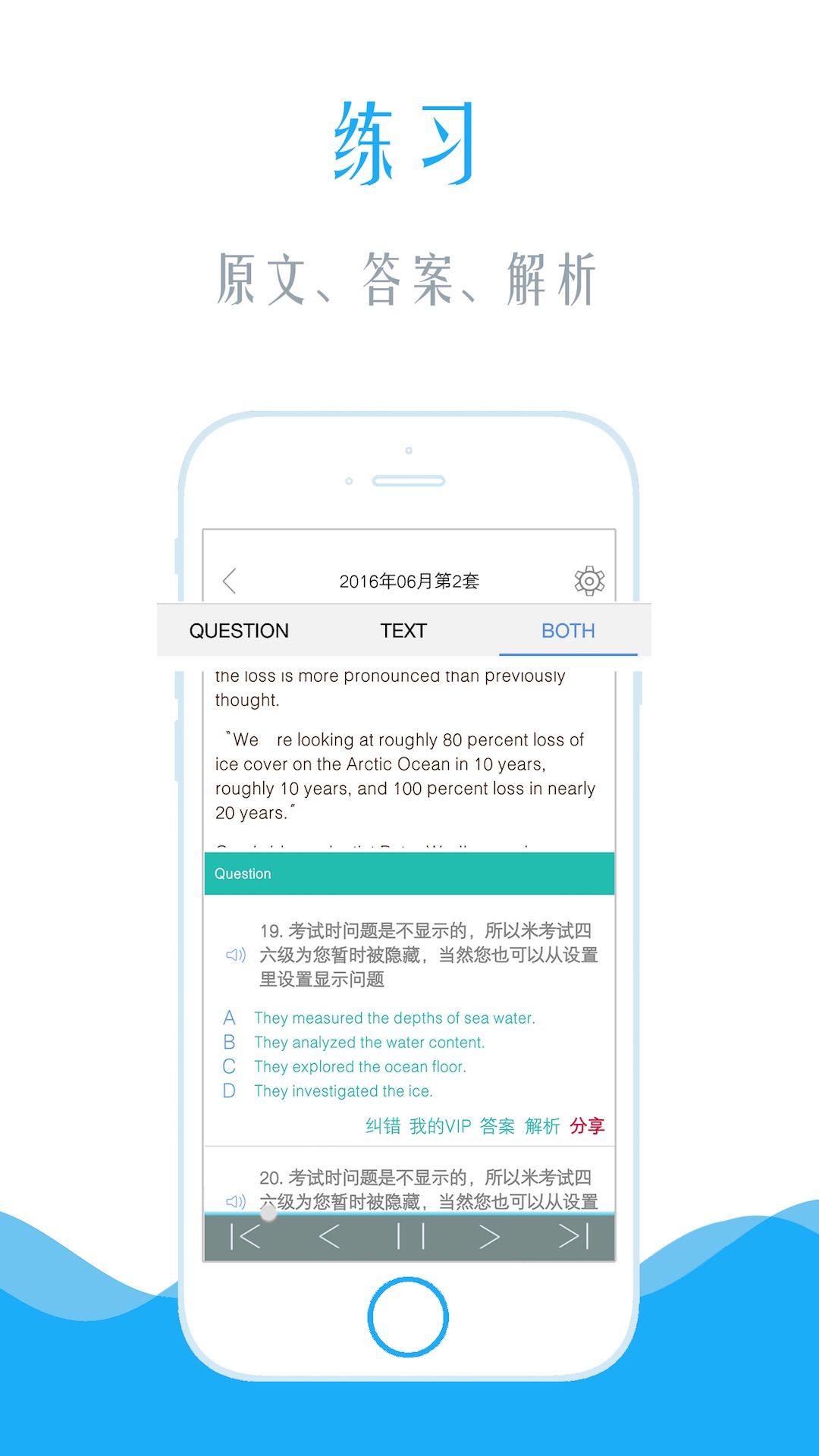 四級閱讀app包括2006年6月到2016年6月的所有四級閱讀真題,你可以隨時隨地的練習六級閱讀,確保你四級在最短的時間取得最高的成績。四級閱讀app是英語四級真題閱讀模擬練習,英語四級考試閱讀部分包含所有的題型,詳細的答案解釋,真正體驗四級考場上的感覺。此外此款軟件還有收藏功能,可以收藏你打錯的試題及不熟悉的單詞,方便你以后復習,且軟件有統(tǒng)計成績的功能,你可以對比你在不同時期做題的正確率。