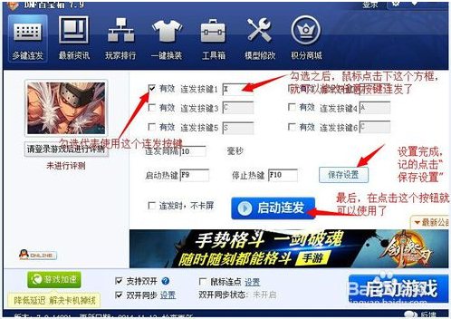 2、具體修改方法如圖所示,勾選代表使用這個連發(fā)按鍵,不勾選代表不使用這個連發(fā)按鍵。設(shè)置完成后,記得點擊下保存設(shè)置,點擊啟動連發(fā),就可以使用連發(fā)功能了。