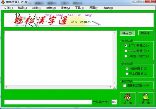 中華拼讀王是一款非常強大的漢字拼讀軟件,您可以導入本地的文本文件,也可以手動錄入,軟件會自動對您輸入的漢字標注拼音,幫助您學習漢語,軟件內(nèi)置語音引擎,可以非常準確清晰的將您輸入的內(nèi)容朗讀出來,讓您掌握正確的發(fā)音。【軟件特點】