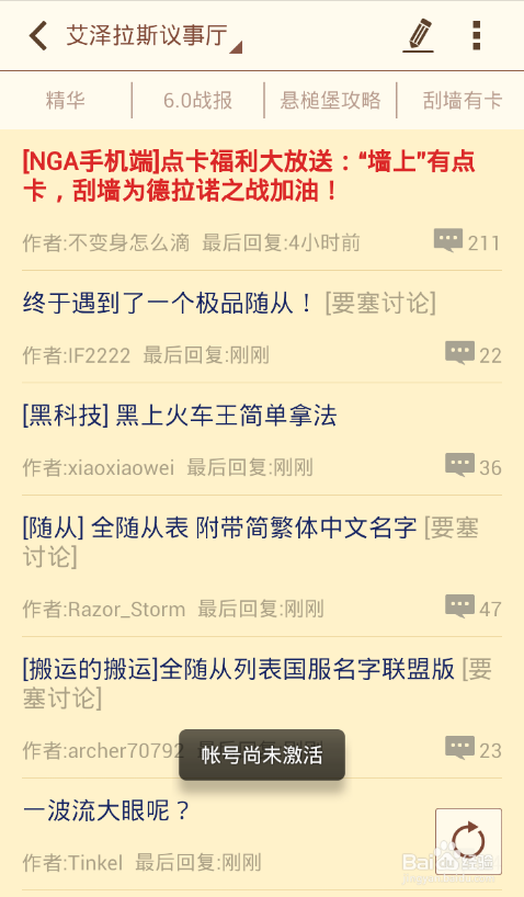 當你進去到nga后想要發(fā)帖子會遇到下面的情況,就是提醒你的賬號尚未激活,那么怎么激活呢。