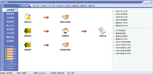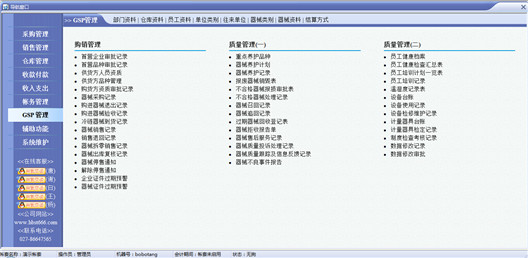 基本功能:智能訂貨、進(jìn)貨入庫、進(jìn)貨退回、銷售出庫、銷售退貨、報(bào)損、報(bào)溢、調(diào)入、調(diào)出、拆零、組裝、盤點(diǎn)、GSP、收款、付款、預(yù)收、預(yù)付、收入、支出、成本、利潤及財(cái)務(wù)會(huì)計(jì)核算等。