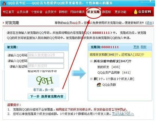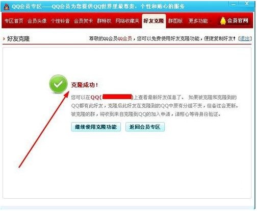3、下一步來(lái)到QQ會(huì)員專區(qū)中,選擇好友克隆的選項(xiàng)就可以啦;