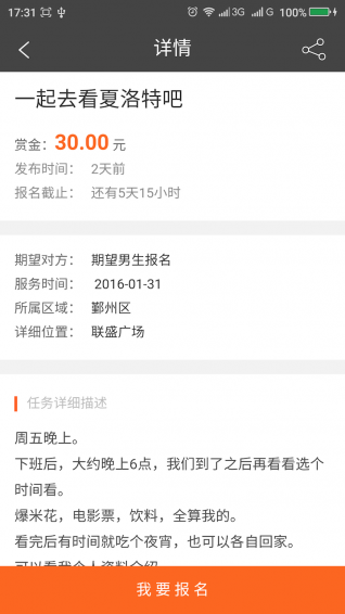 當(dāng)你無聊、寂寞、需要人陪伴的時(shí)候,來黃花樹,可以快速找到愿意陪你逛街、吃飯、K歌、看電影、爬山…的人;你需要做的,僅僅是來黃花樹發(fā)布一條賞金任務(wù)。如果你有很多空閑時(shí)間,也可以到黃花樹報(bào)名其他用戶的賞金任務(wù),吃喝玩樂的同時(shí),還能賺到賞金哦。