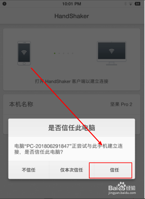 點(diǎn)擊頁面中的錘子手機(jī)的上的“連接”,電腦會(huì)自動(dòng)連接錘子手機(jī)。這時(shí)錘子手機(jī)會(huì)彈出一個(gè)窗口,我們點(diǎn)擊“信任”選項(xiàng),信任該電腦。