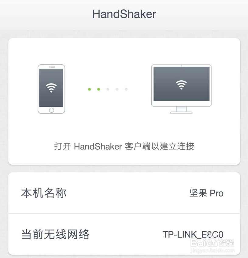 這時(shí)我們打開手機(jī)上的軟件,就會(huì)看到提示我們“打開HandShaker客戶端以建立連接”。
