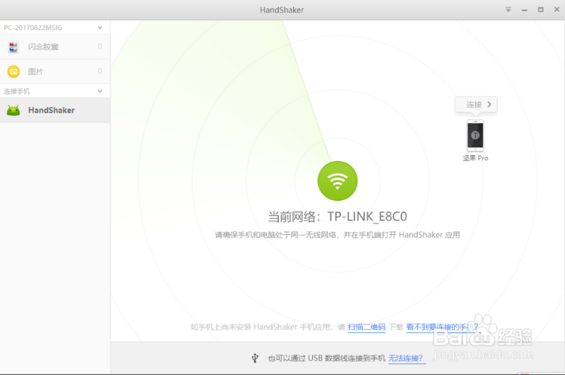 在這里小編要說兩點(diǎn),一是在同一無線網(wǎng)絡(luò)下,二是電腦和手機(jī)連接的時(shí)候,記得都要打開HandShaker軟件,如果只有手機(jī)或電腦一個(gè)設(shè)備打開是搜不到的。