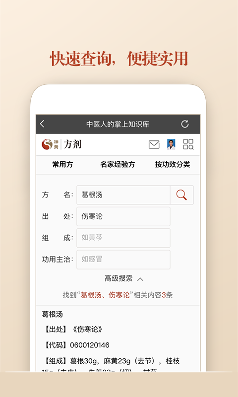 --簡便實用:支持按方名、功效、組成、出處查詢。
