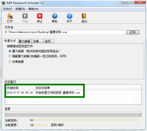 3、接下來點擊“打開”按鈕選擇要破解的WinRAR文件。然后選擇其中一種破解類型,當我們對密碼信息一無所知時,小編建議選擇“暴-力-破解”項,最后點擊“開始”按鈕正式進入破解過程。