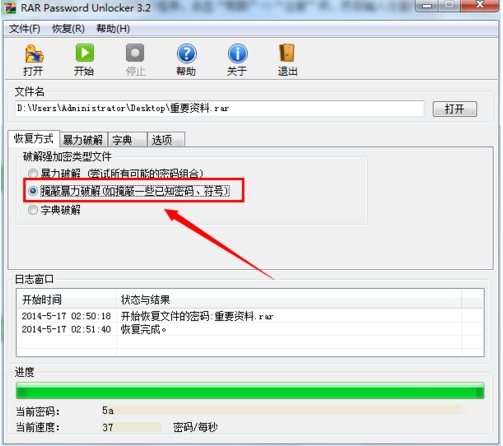 4、當然,如果要破解的壓縮文件是自己之前所設置的密碼,那么我們可以利用“掩蔽暴力破解”方式進行破解,從而大大減少破解所需要的時間。勾選“掩蔽暴力破解”項。