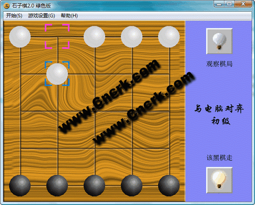 本軟件為綠色免安裝軟件。石子棋游戲是一種兩人對弈的小型棋類游戲。雙方棋手各有五個棋子,在一個4x4的格子棋盤上對弈。按照游戲規(guī)則吃子,當(dāng)一方棋手的棋子小于等于一時,則另一方獲勝。您可以選擇與電腦對弈或兩人對弈;其中電腦的級別又分初、中、高三種。詳細(xì)說明請查看幫助文檔。