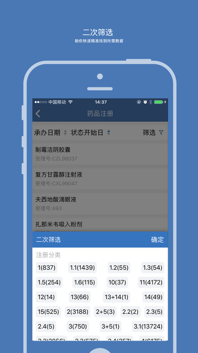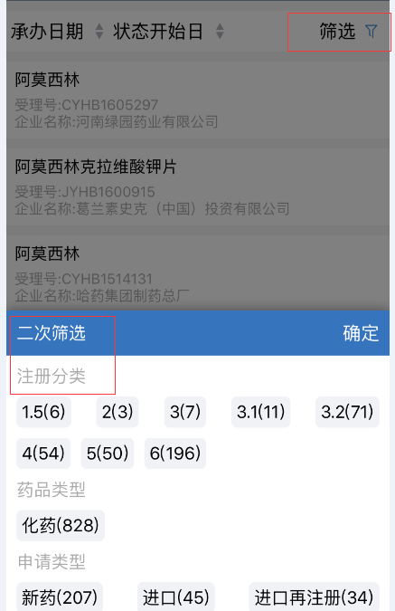在藥品注冊數(shù)據(jù)庫輸入查詢條件之后,進(jìn)入列表頁,點(diǎn)擊右上角的篩選(注:此功能為VIP會員特權(quán)),可對注冊分類、藥品類型、申請類型、審評結(jié)論等進(jìn)行二次篩選。讓用戶更快捷方便地查詢到信息,了解相關(guān)產(chǎn)品更詳細(xì)全面的數(shù)據(jù)。