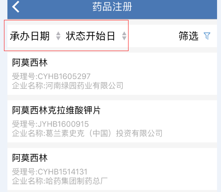 以藥品注冊為例,在藥品注冊數(shù)據(jù)庫輸入查詢條件(包括藥品名稱、受理號碼、企業(yè)名稱等條件),點(diǎn)擊搜索。再選擇承辦日期或狀態(tài)開始日,可對列表進(jìn)行排序。