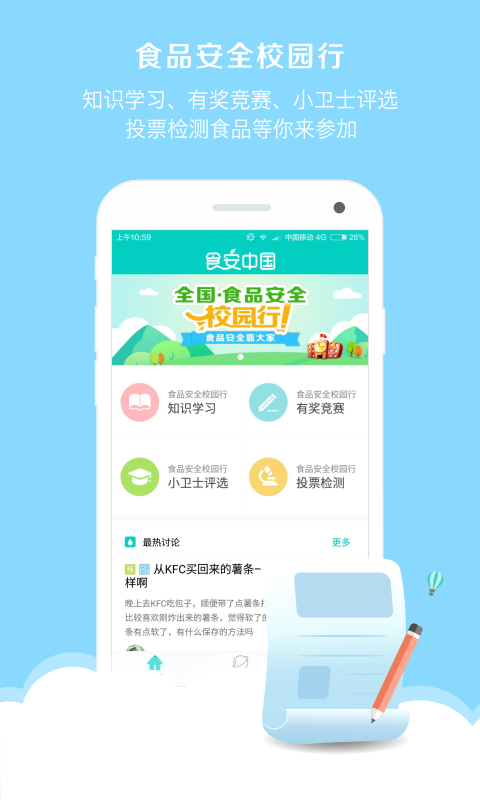 1、食品安全校園行:食品安全知識(shí)學(xué)習(xí)、有獎(jiǎng)競(jìng)賽、食安小衛(wèi)士評(píng)選、投票檢測(cè)食品活動(dòng)等你來參加。2、掃碼查安全:食品掃碼查健康。輕松掃描食品包裝條形碼,實(shí)時(shí)動(dòng)態(tài)查看專業(yè)的食品安全檢測(cè)報(bào)告、選購(gòu)知識(shí)以及常見問題。掃描查看安全詳情,遠(yuǎn)離有毒有害產(chǎn)品。