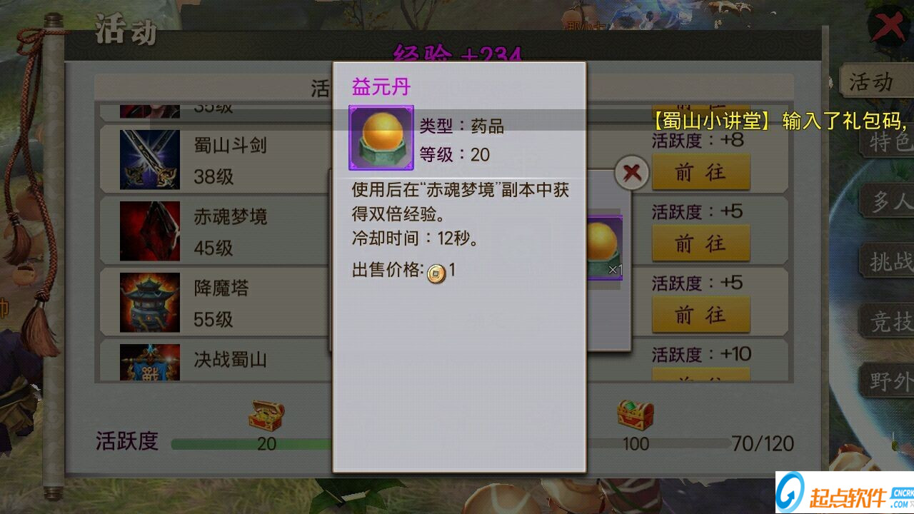 3,45多人挑戰(zhàn)副本赤魂夢境。每日一次?;陦艟潮倦m然要消耗10綁定元寶,但經(jīng)驗收獲十分豐厚。進本時記得使用活躍度禮包中獲得的益元丹,使用后在赤魂夢境中可獲得雙倍經(jīng)驗。