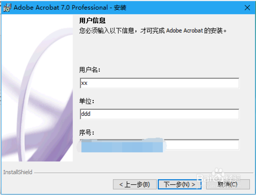 在Adobe Acrobat 7.0 Professional安裝用戶信息界面,輸入用戶名、序號(hào),點(diǎn)擊下一步,PDFMarker安裝和集成信息窗口點(diǎn)擊下一步按鈕。