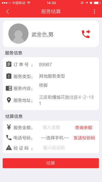 服務(wù)公司派遣服務(wù)工作人員上門(mén)服務(wù)時(shí)使用該APP進(jìn)行賬務(wù)結(jié)算,大大方便了,服務(wù)人員的老式結(jié)算方案:服務(wù)完成需要會(huì)總部結(jié)算。