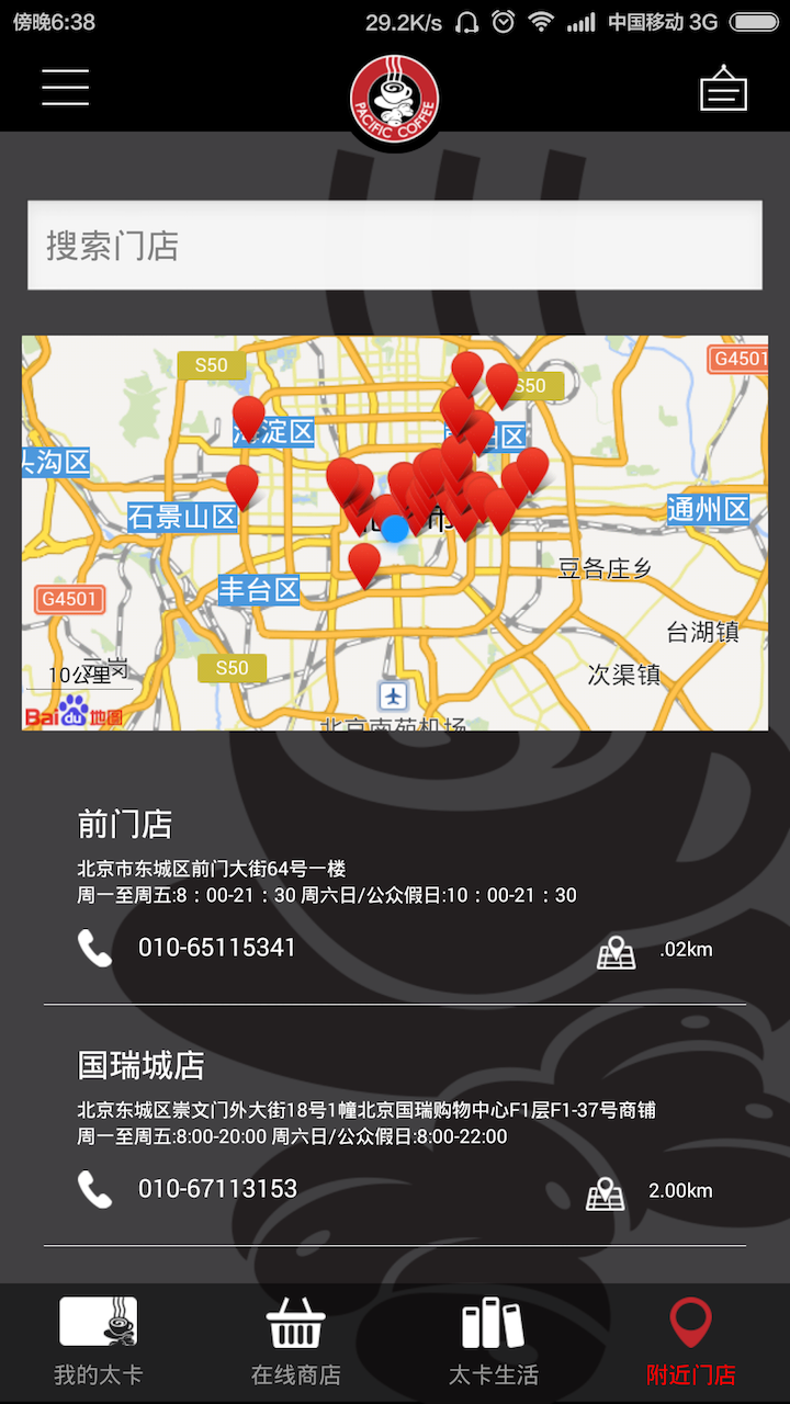 可快速查閱您想了解的門店信息,導(dǎo)航支持,找到離你最近的太平洋咖啡