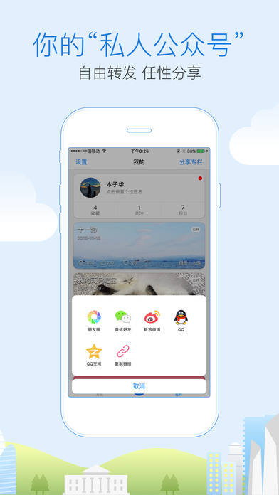 -一鍵分享到朋友圈、微博、QQ空間等社交平臺(tái),打造你自己的內(nèi)容頭條號(hào)