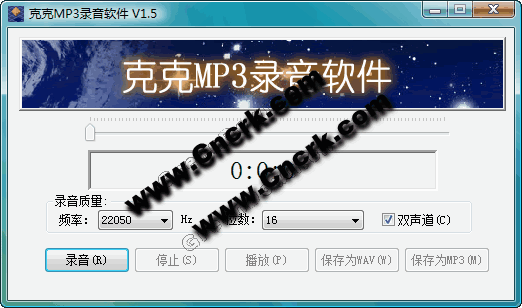 克克MP3錄音軟件 V1.5 簡體中文綠色免費版 克克MP3錄音軟件是一款專業(yè)且完全免費的錄音軟件,錄音質量優(yōu)質,另外您也可以自己選擇錄音質量,只要您擁有麥克風話筒就可以通過本軟件進行錄音。本軟件對錄音時間無限制。錄音后可保存為wav和mp3格式。歡迎使用克克網的免費錄音軟件。