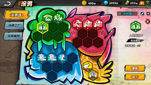 點(diǎn)擊空的涂鴉槽,會(huì)在屏幕右邊顯示我們以有的對(duì)用顏色涂鴉,點(diǎn)擊想要的涂鴉就可以將涂鴉放置到涂鴉槽當(dāng)中。如果想要替換以有的涂鴉,可以點(diǎn)擊想要替換的涂鴉,然后點(diǎn)擊屏幕右側(cè)的更換再點(diǎn)擊想要的涂鴉就可以完成替換。
